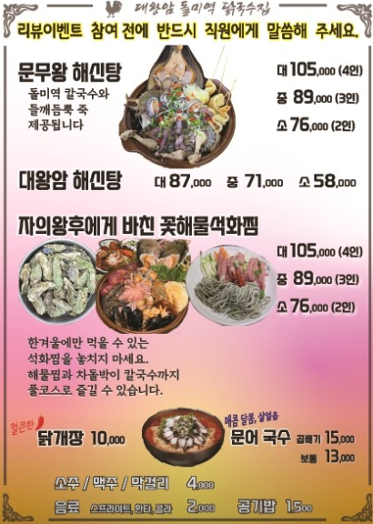 - 메뉴 추천: 문무왕해신탕, 대왕암해신탕도 있으니 마음껏 맛보세요.